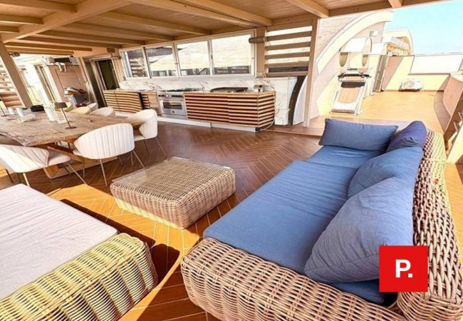 La soluzione è composta da ampia zona living con cucina a vista e affaccio sul bellissimo terrazzo attrezzato, camera matrimoniale con cabina armadio, due camerette, tre bagni, balcone perimetrale.